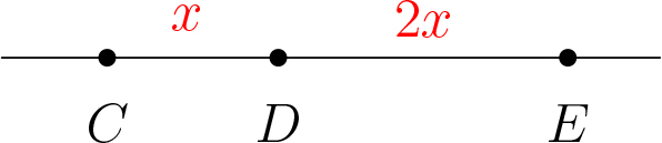 3 Шулуун дээр $C,\ D,\ E$ цэгүүд энэ дарааллаараа байрлана. $CD$-ийн урт $DE$-ээс 2 дахин бага ба $CE$-ийн урт $CD$-ээс $4$ нэгжээр их бол $DE$-г ол.