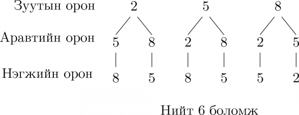 Эхний цифрийг $3$ янзаар сонгож болох ба дараагийн цифрийг $2$ янзаар, сүүлийн цифрийг $1$ янзаар сонгоно. Иймд, эдгээр цифрүүдээр цифр давтагдаагүй $3$ оронтой тоо зохиох боломжийн тоо нь $$3\times2\times1=6$$ байна.