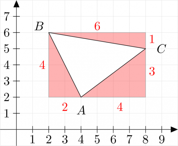 Дараах зурагт зурагдсан тэгш өнцөгтийн талбайгаас будагдсан хэсгүүдийн талбайг хасвал $ABC$ гурвалжны талбай гарна.