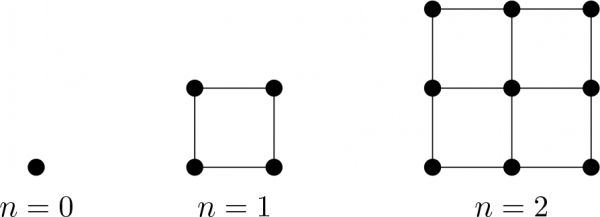 17 Дараах зурагт үзүүлснээр натурал $n$ тооны хувьд $n\times n$ хэмжээст квадратын зангилааны цэгүүдийг холбосон $1$ урттай хэрчмүүдийн тоогоор $\{a_n\}$ дараалал үүсгэе. $a_0=0$, $a_1=4$, $a_2=12$ гэх мэт үргэлжлэнэ. Тэгвэл $\{a_n\}$ дарааллын ерөнхий гишүүний томьёо аль вэ?